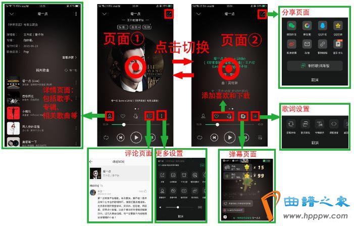 播放模块是由主界面底部悬浮的入口上弹进入(见2、3、4、5四个页面中的播放模块入口),播放页面有三个,如上图,从左到右分为歌曲消息页面、歌曲专辑页面、滚动歌词页面,通过驾驭滑动切换,而且每个页面也嵌套辅帮功效,囊括闭系引荐,歌曲保藏、分享、删除等操作,其它再有弹幕和歌词海报等新意功效,利便用户举行多种听歌体验。