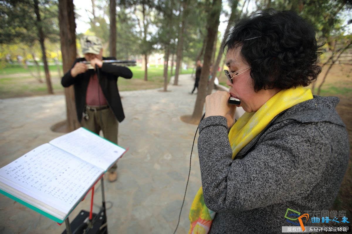 北京日坛公园,绿阴如盖,奼紫嫣红,伴跟着《多瑙河圆舞曲》俊美的旋律寻去,许先生和他的老伴正正在举行口琴吹奏……