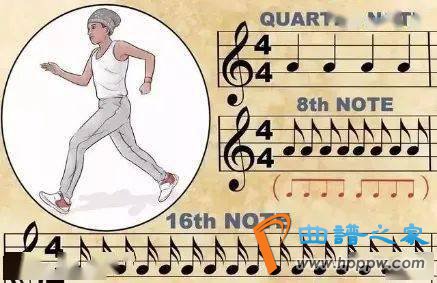 每一步代表一个四分音符,你可能边走边数:“1,2,3,4-1,2,3,4”。正在五线谱中四分音符即是一个实心的符头加一根符干,不带任何符尾。