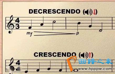念要音量越来越大或越来越幼,你须要应用另一种常见的力度符号:渐强标记和渐弱标记。它们把音量渐变的历程用一种可视的式样涌现了出来。
