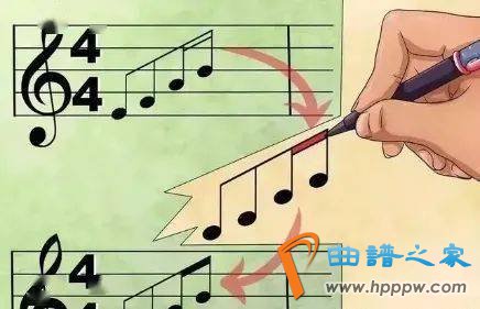 正在上一张图片中咱们可能看到,当音符变多的岁月,感触会有一点芜杂,或者看着看着就不晓得到哪儿了。为领略决这个题目,咱们将音符一幼组一幼组地分隔,并用符干接连起来。