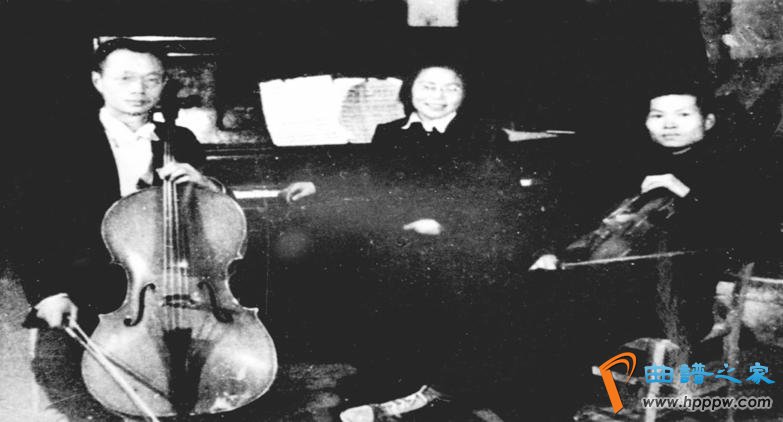△图为鲁艺音笑系教练(左起)张贞黻、寄明、向隅 1941年秋正在音笑会上吹奏幼提琴、大提琴、钢琴三重奏