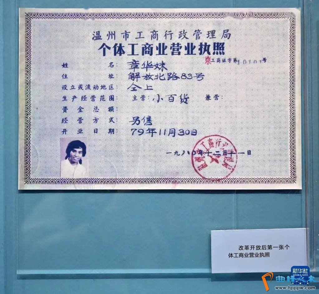 这是正在 “伟大的改革——道贺鼎新怒放40周年大型展览”上拍摄的鼎新怒放后第一张个人工贸易贸易牌照(2018年11月15日摄)。新华社记者 李鑫 摄