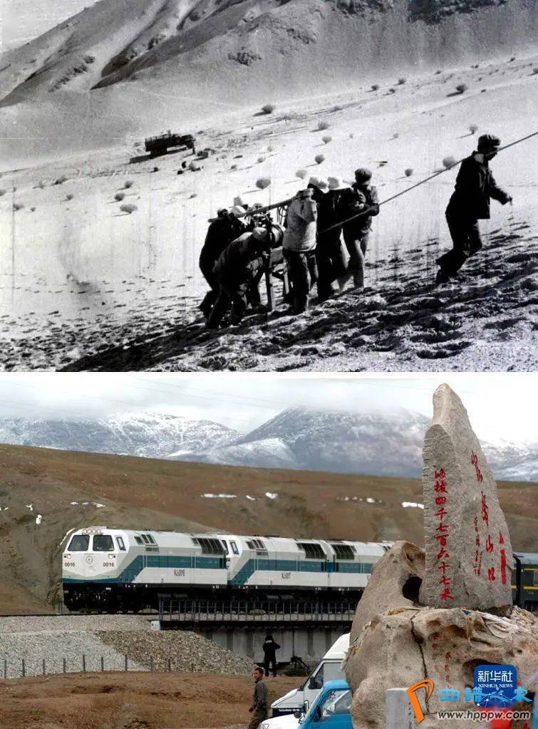 拼版照片:上图为20世纪50年代拍摄的测量青藏线日,青藏铁途全线通车。这是从格尔木开拔的“青1”次列车历程海拔4767米的昆仑山口(新华社记者侯德强摄)。新华社发