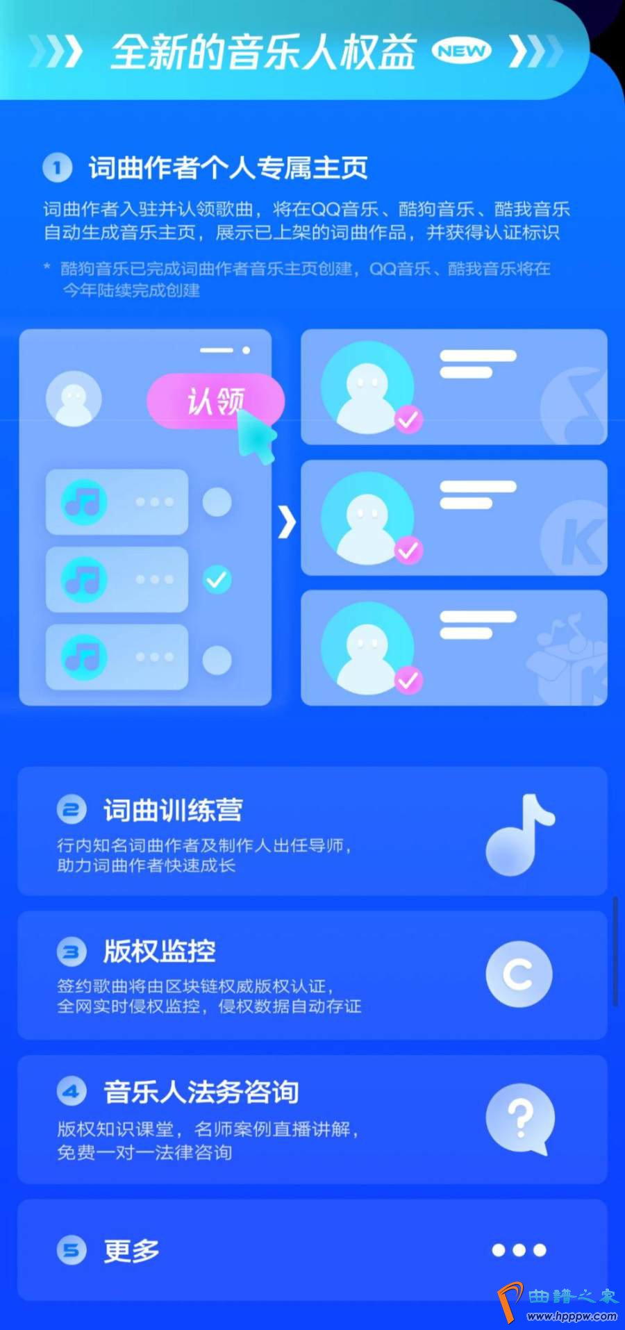 为了让词曲作者获得进阶成长的机会,同时也免除独立音乐人在版权管理上的后顾之忧,从而专注于创作,带来更多高质量的原创音乐作品,顺利实现音乐梦想。亿元激励计划3。0除了为音乐人带来直观的收入与有效的宣推措施外,还在词曲作者权益方面更进一步的升级优化。