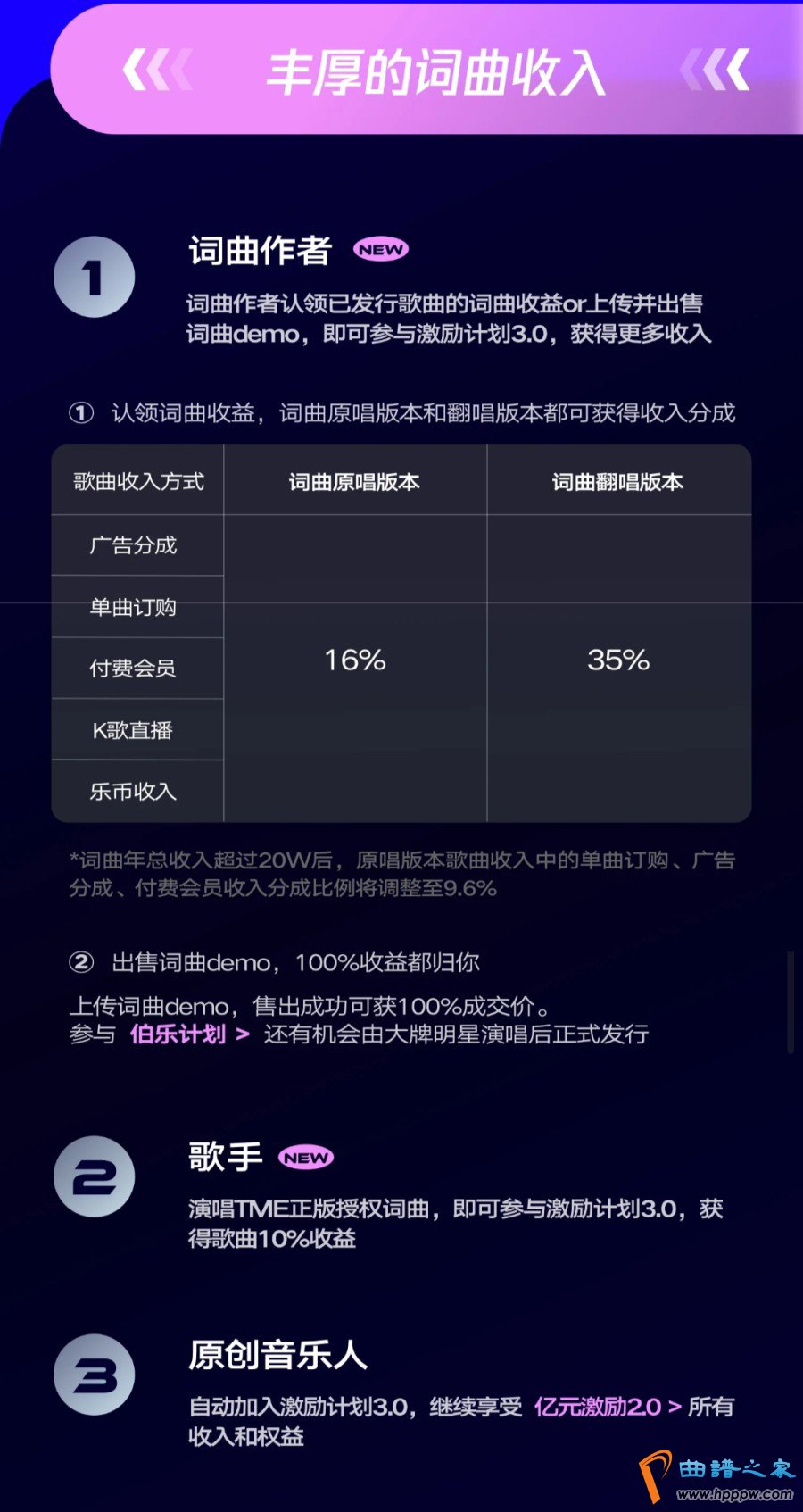 为给词曲创作者打造更好的生存环境,助力其在逐梦音乐之路上永葆炙热之心。亿元激励计划3。0为词曲创作者提供了切实、直观的收益分成计划,词曲作者入驻开放平台成为Q音音乐人之后,通过成功认领词曲权益,无论是原唱还是翻唱,词曲作者均可从中获得分成,其中包含广告分成、单曲订购、付费会员、K歌直播、乐币打赏等多项收入来源。并且词曲作者也可上传并出售词曲作品(demo),一旦成功售出,即可获得100%收益。