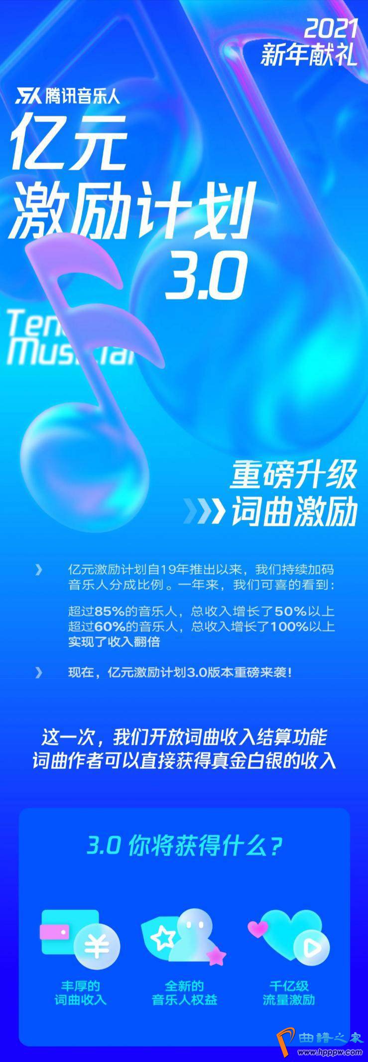 让每一个好歌声都能被听到,让每一份好创作都得到回报!新年伊始,开放平台联合腾讯音乐人全面开启亿元激励计划3。0,在2。0的基础之上继续加码扶持音乐人,更重磅加入对词曲创作者的扶持,通过收益激励、权益激励、流量激励三大优化升级激励举措,助力音乐人在实现梦想的同时又能获得丰厚收益。