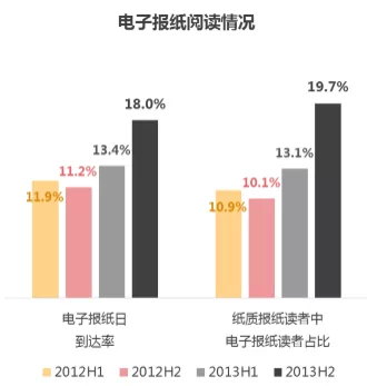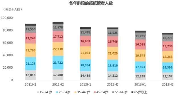 报纸读者平均每天阅读1。8份报纸,其中25-44岁人群每天阅读2分以上报纸,而55岁以上人每天阅读报纸份数最少。