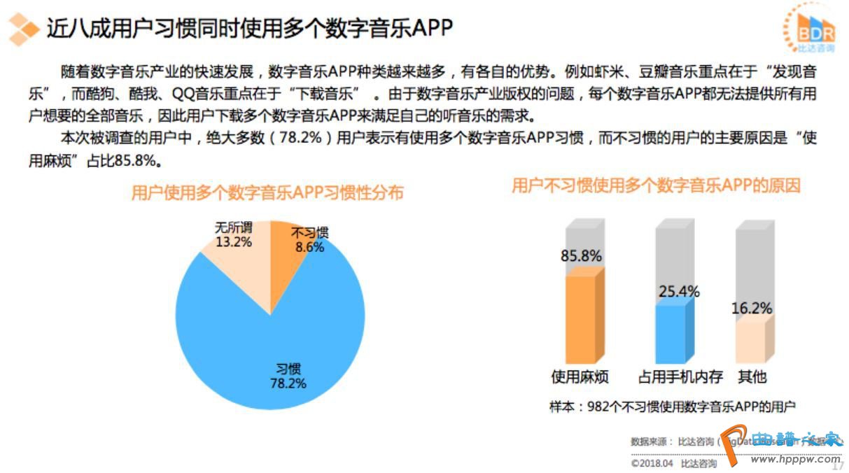 通过上图可以发现,不习惯使用多个音乐类app的用户仅仅只占总人数的10%不到,即几乎所有的用户都可以接受同时安装并使用多个不同的音乐类app,音乐类app的共存现象十分普遍。