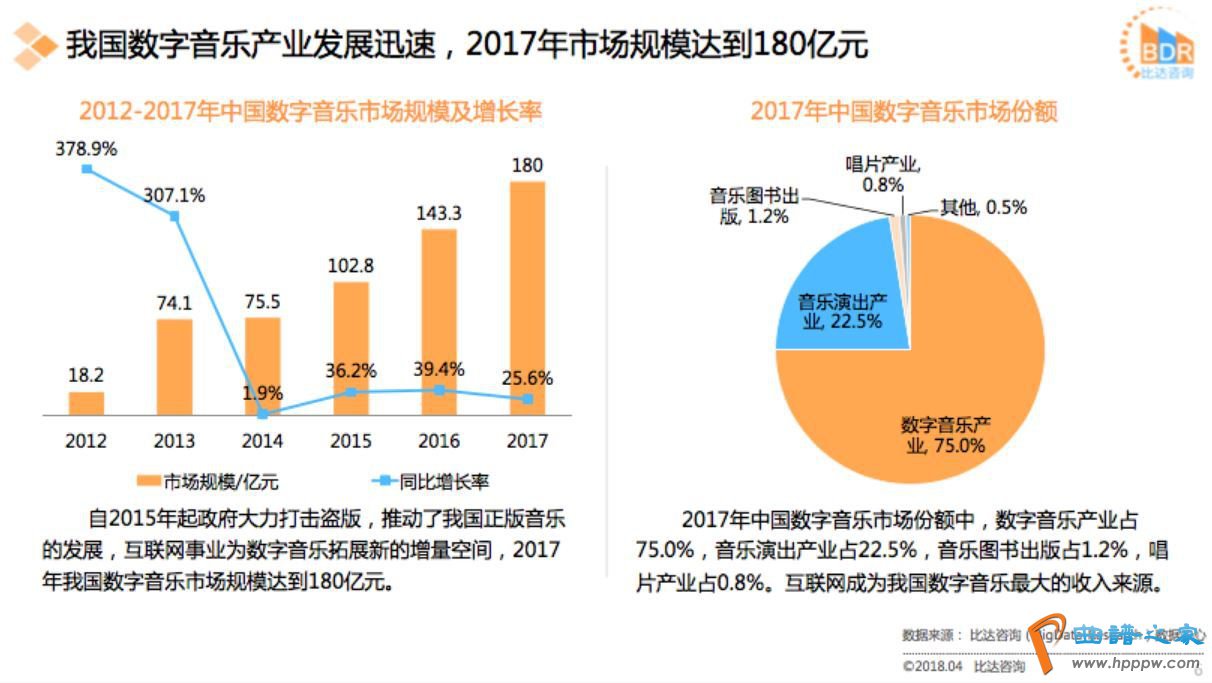 数字音乐的发展势头良好,从2014年开始进入稳步发展时期,2017年已经拥有了180亿的市场。从市场份额上讲,数字音乐产业占比也达到了惊人的75%,相当于其他产业加起来的三倍,成为了最主流的音乐产品消费方式。