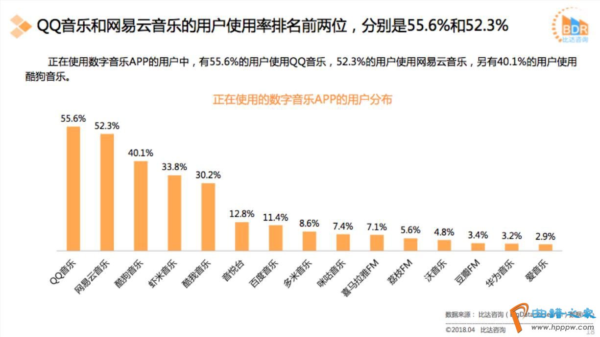 网易云音乐的使用率和接近位于第二位并遥遥领先于其它音乐类app。考虑到背靠用户数量恐怖的腾讯集团,网易云音乐能够达到这个成绩已经相当不容易了,虽然网易云音乐也背靠网易公司,但是就用户数量上来讲,拥有网易账号的用户和拥有腾讯账号的人相差甚远。在如此大的劣势下还能够拥有这样的成绩,可见网易云音乐确实有其优秀之处。