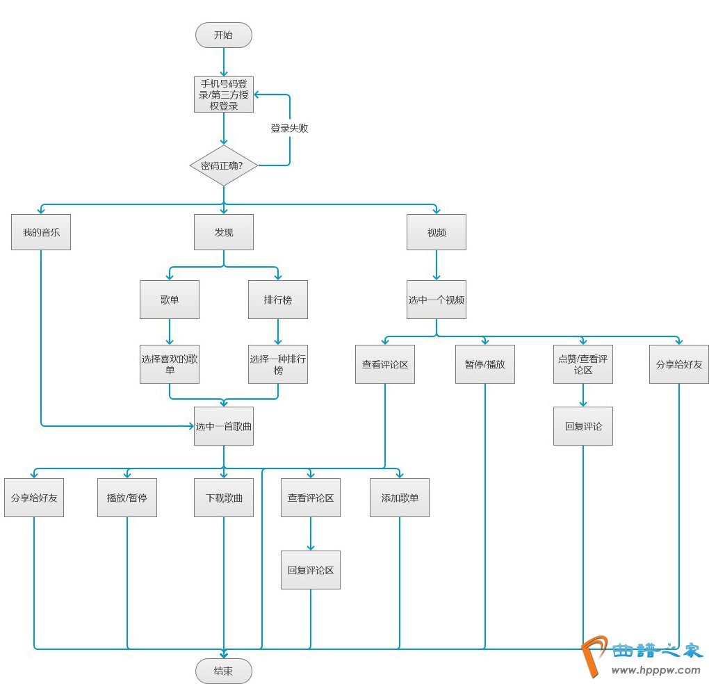 网易云音乐的功能很多,没有必要全部列举,这里以一个用户登录并找自己喜欢的歌曲以及MV为例绘制用户使用流程图。