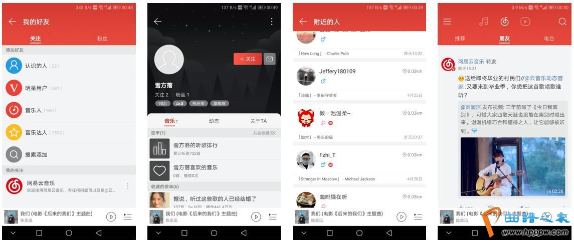 上面提到的方式是通过自己的关系网来添加好友,而附近的人这个功能则是通过地理位置信息来添加好友,通过这个功能可以看到自己周围的用户,看看他们都喜欢听什么歌曲,也许就能够找到和自己有共同爱好的用户。对于一个人在大城市中打拼的人来讲,一个人寂寞的时候看看周围的人也和自己一样听着寂寞的歌瞬间就会觉得自己不是一个人,理想即离乡。