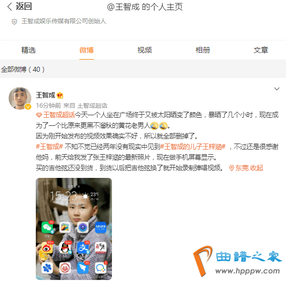 11月26日下午,内地商人、艺人王智成晒完太阳后更新了一条信息量较大的内容,他在文中称因不满意思已经拍好的短视频作品全部都已经删除。王智成还透露已经两年时间没有在现实中见到其儿子王梓涵,感谢王梓涵妈妈发了一张最新照片,王智成用作手机屏幕显示图片。