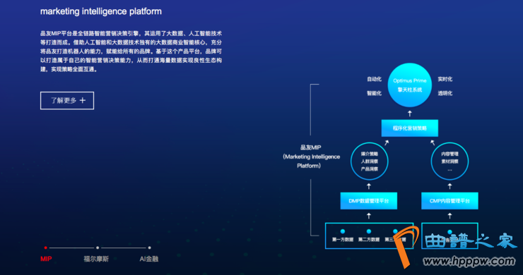 2017年上线的MIP(Marketing Intelligence Platform)平台,有效整合了DMP数据管理平台、CMP内容管理平台和PDB智能投放管理系统三大模块。智能策略引擎DMP整合媒体价值洞察、人群深刻洞察、科学归因模型,智能内容引擎CMP包括创意内容云端管理、产品改建创意测试、自动创意物料调优。导出智能化营销策略,对接到智能投放管理系统(程序化广告投放、常规广告投放管理、社交广告管理、电商投放管理)。最后,智能投放管理系统再反哺于DMP、CMP。其中,擎天柱系统Optimus Prime具备自动化、实时化、智能化、透明化四个特点。