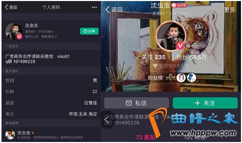 自 2014 年,沈虫虫在美拍发布第一个音乐短视频,截至目前,沈虫虫在美拍分享的音乐作品近百首,吸引了逾 51。5 万网友的关注。视频总播放量突破 6000 万次。