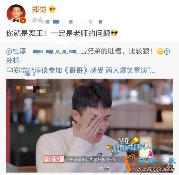 近日,郑恺的好友杜淳和老婆参加节目时,还邀请了他一起喝酒。郑恺在节目中还学杜淳跳了一段舞蹈,画面十分搞笑。两人互相吐槽的样子,还是圈粉郑恺还特意转发视频为杜淳做宣传。两人关系看起来很是不错,可见郑恺的人缘很好。