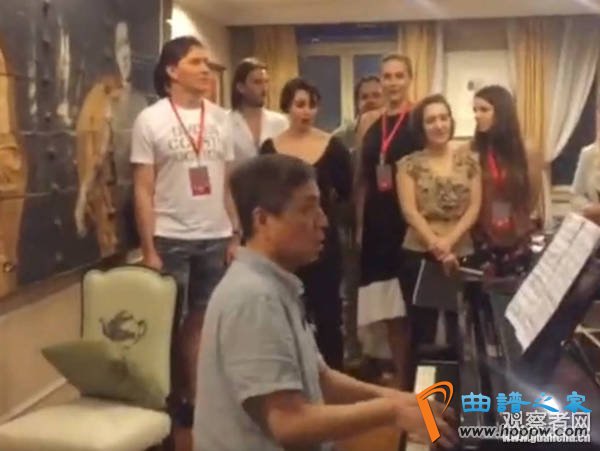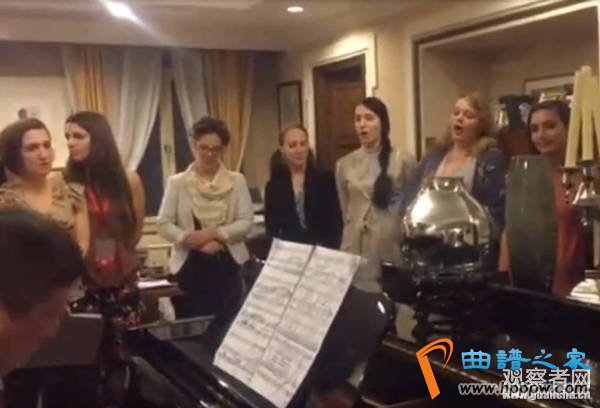 视频中,钢琴旁清一色的高鼻梁深邃眼睛。不大的房间里,14名老外站在钢琴前,随着钢琴的演奏分声部歌唱。