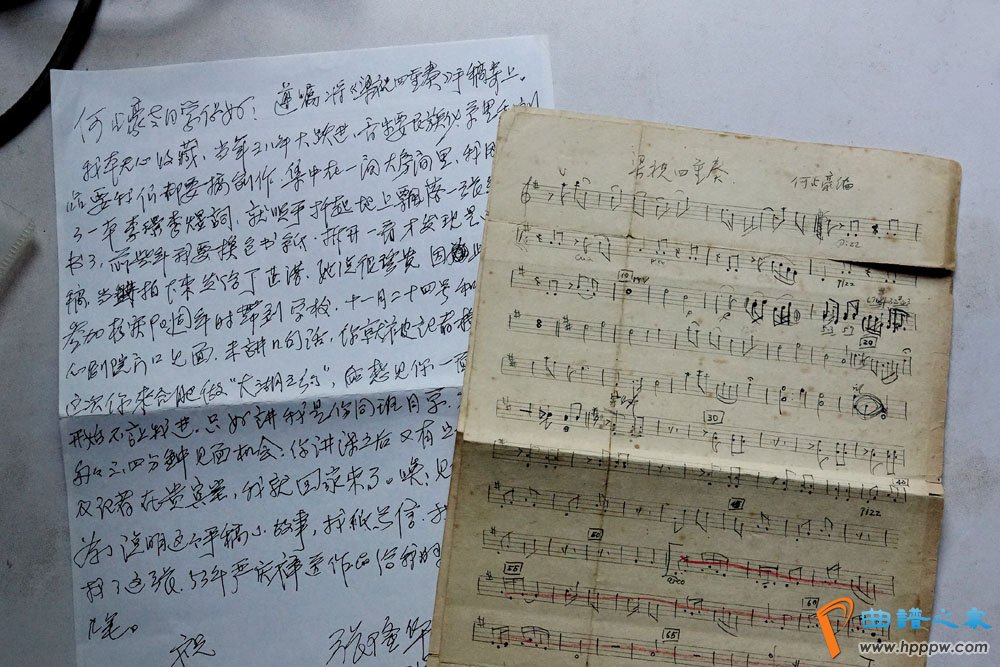 当年“小梁祝”首演完,总谱借给了当时来华演出的捷克斯洛伐克斯美塔那弦乐四重奏,后散失不见。直到去年,《梁祝》诞生六十周年,何占豪在安徽遇见老同学张隆华。对方提起自己偶然找到当年用来包书的一张纸——竟然是“小梁祝”的分谱!不久后,张隆华去邮局把这份“出土文物”寄给了何占豪,还附上一封亲笔信,回忆当年的故事。