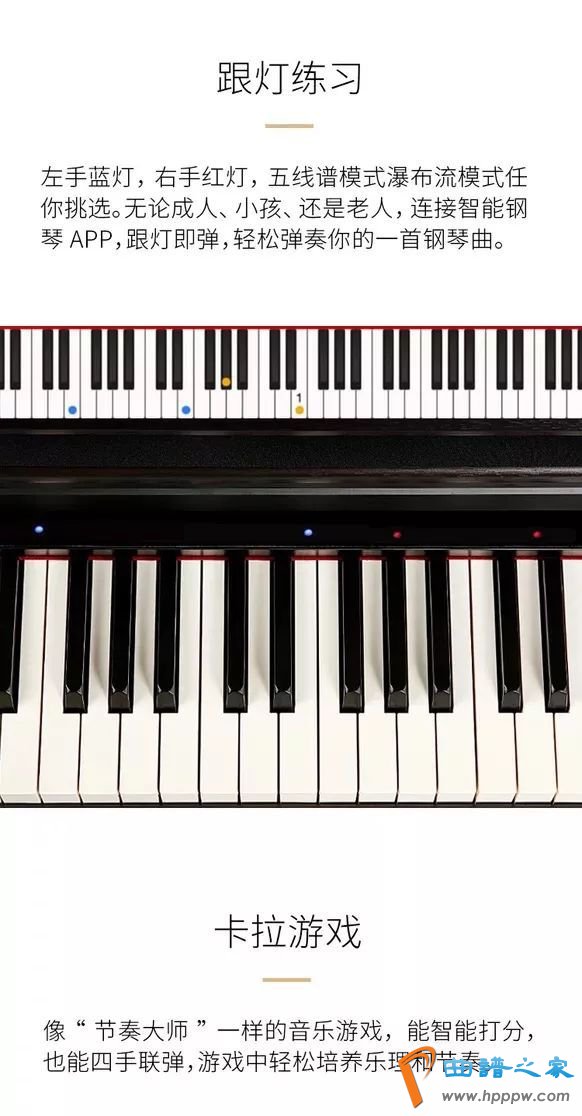 APP应用中,拥有海量曲谱,实时更新,试听、分手练习、重点片段练习,还有录音分享功能;卡通游戏,让学琴像玩游戏一样轻松;128个GM音色和四个鼓组,上百种高品质音色随意选,随心编曲创作;针对儿童的智能钢琴课APP,有量身定制梯度教学法,经典儿歌在家随时学,还有郎朗独家演奏示范,手把手教孩子弹钢琴。
