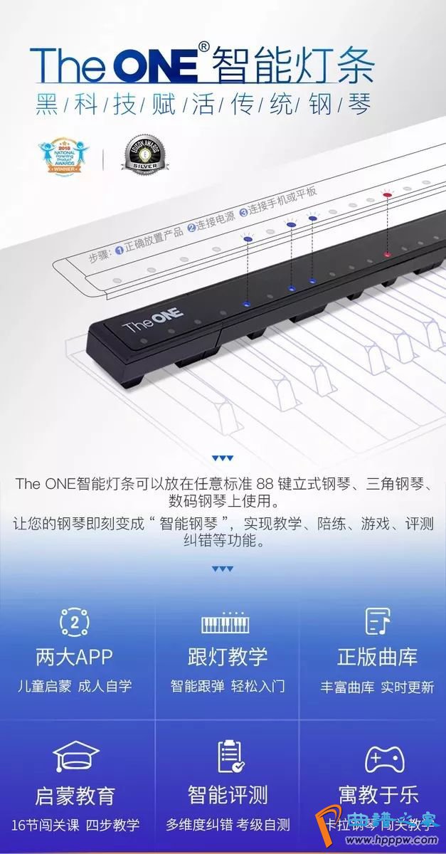 The ONE开发的智能灯条,作为业内首家真正实现人工智能音乐教学的硬件,适用于任意标准88键立式钢琴、三角钢琴、数码钢琴。