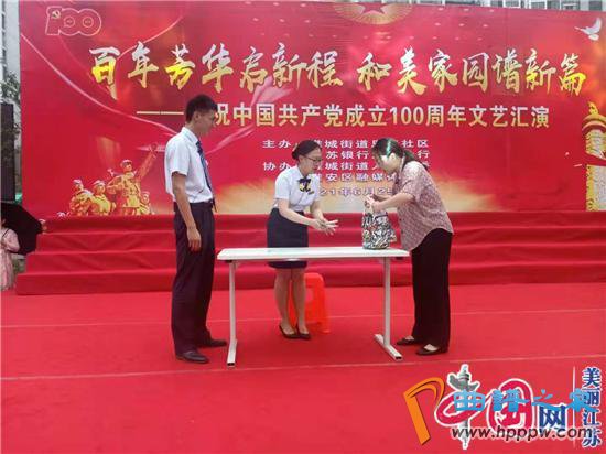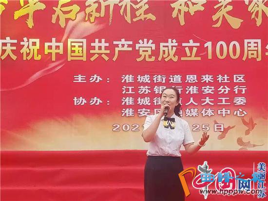 6月25日下午,为铭记奋斗历程,担当历史使命,激励干群弘扬恩来精神,推进温暖治理,共建美好家园,由淮安区淮城街道恩来社区党委、江苏银行淮安分行主办,淮城街道人大工委、区融媒体中心承办,“百年芳华启新程,和美家园谱新篇”庆祝中国成立100周年文艺汇演在恩来社区海棠广场举行。恩来社区13个群众文艺团体与江苏银行员工以对党忠诚,听党话,永远跟党走的信念,自编自演,捧献给广大党员群众一场精彩的文艺大餐。