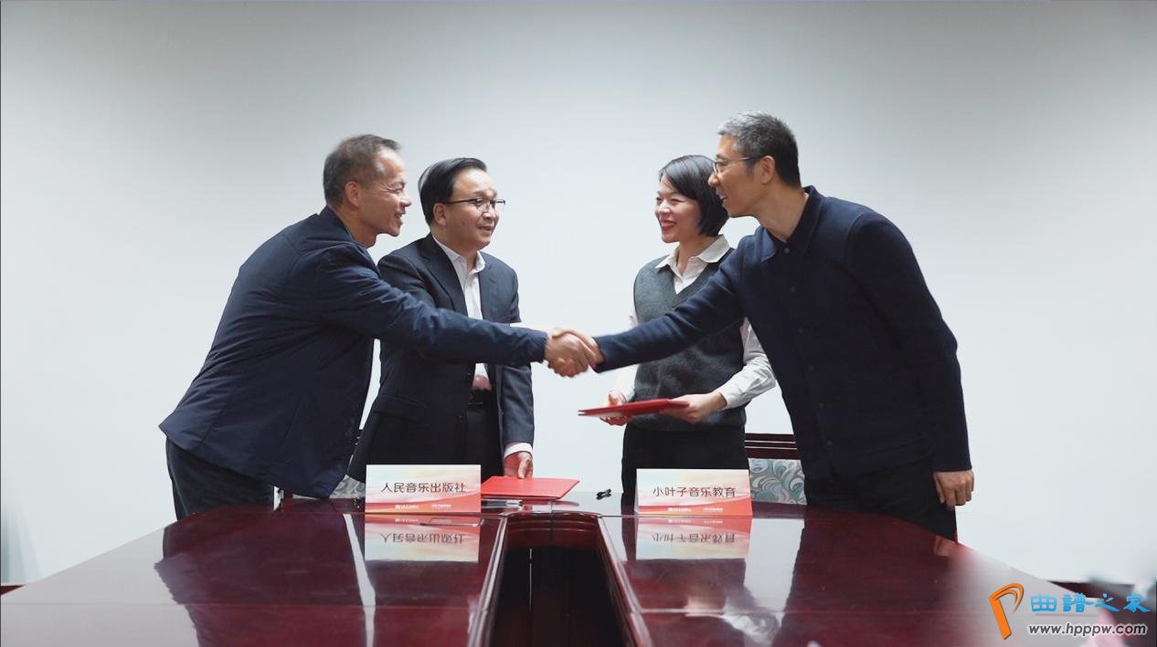 图:人民音乐出版社副总经理魏振华(左2)与小叶子音乐教育联合创始人何雨沙(右2)签约,人民音乐出版社社长沈致金(左1)与小叶子音乐教育创始人叶滨(右1)见证