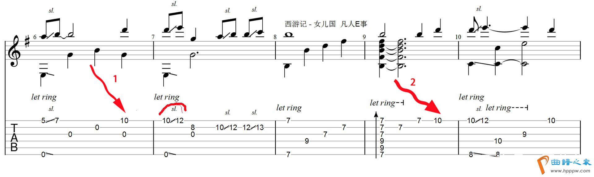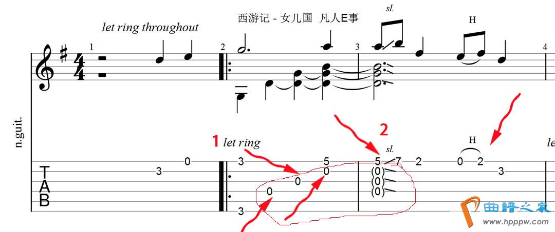 1、本曲弹好的重点需要注意有如下图所示意事项。滑音SEL 延音LET RING 击打音H