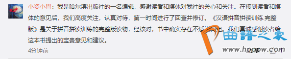 有自称哈尔滨出版社编辑的网友称,在接到读者和媒体的意见后,哈尔滨出版社高度关注,认真对待,第一时间进行了回查并修订。