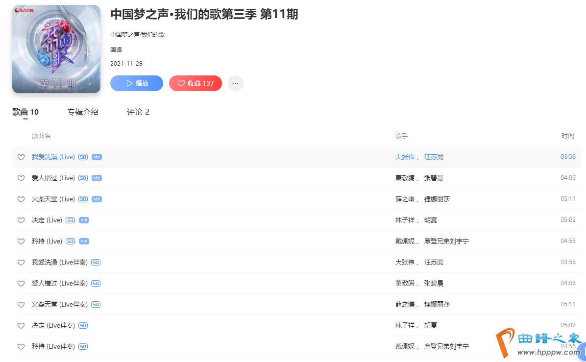 11月28日,《我们的歌第三季》第11期火热播出,这一期是最后决赛“音乐盛典”的第一轮PK。进入最后决赛的组合有五个,分别是萧敬腾、张碧晨的“萧张组合”,薛之谦、锤娜丽莎的“健美组合”,林子祥、胡夏的“牛奶小胡子组合”,戴佩妮、刘宇宁“宇妮走天下组合”、大张伟、汪苏泷“魅力有限公司组合”。总共带来了5首歌的演绎,目前酷狗音乐平台已同步上线期节目的全部音频合辑,让我们一同聆听起来,见证这场音乐盛宴!