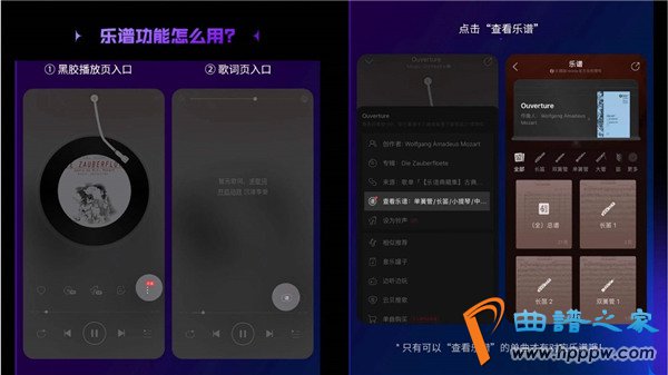 网易云音乐用户可在站内搜索“乐谱”关键词,访问“乐谱典藏馆”专区进行浏览;也可在相关歌曲的播放页点击“更多”按钮查看乐谱。