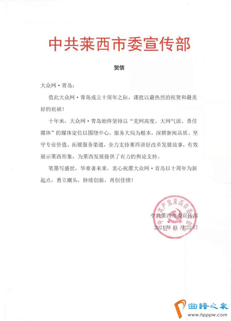 中共莱西市委宣传部发来贺电:十年来,大众网青岛始终坚持以“党网高度、大网气派、责任媒体”的媒体定位以围绕中心,服务大局为根本,深耕新闻品质、坚守专业价值、拓展服务渠道,全力支持莱西讲好改革发展故事,有效展示莱西形象,为莱西发展提供了有力的舆论支持。笔墨写盛世,华章著未来。衷心祝愿大众网青岛以十周年为新起点,勇立潮头,持续创新,再创佳绩!