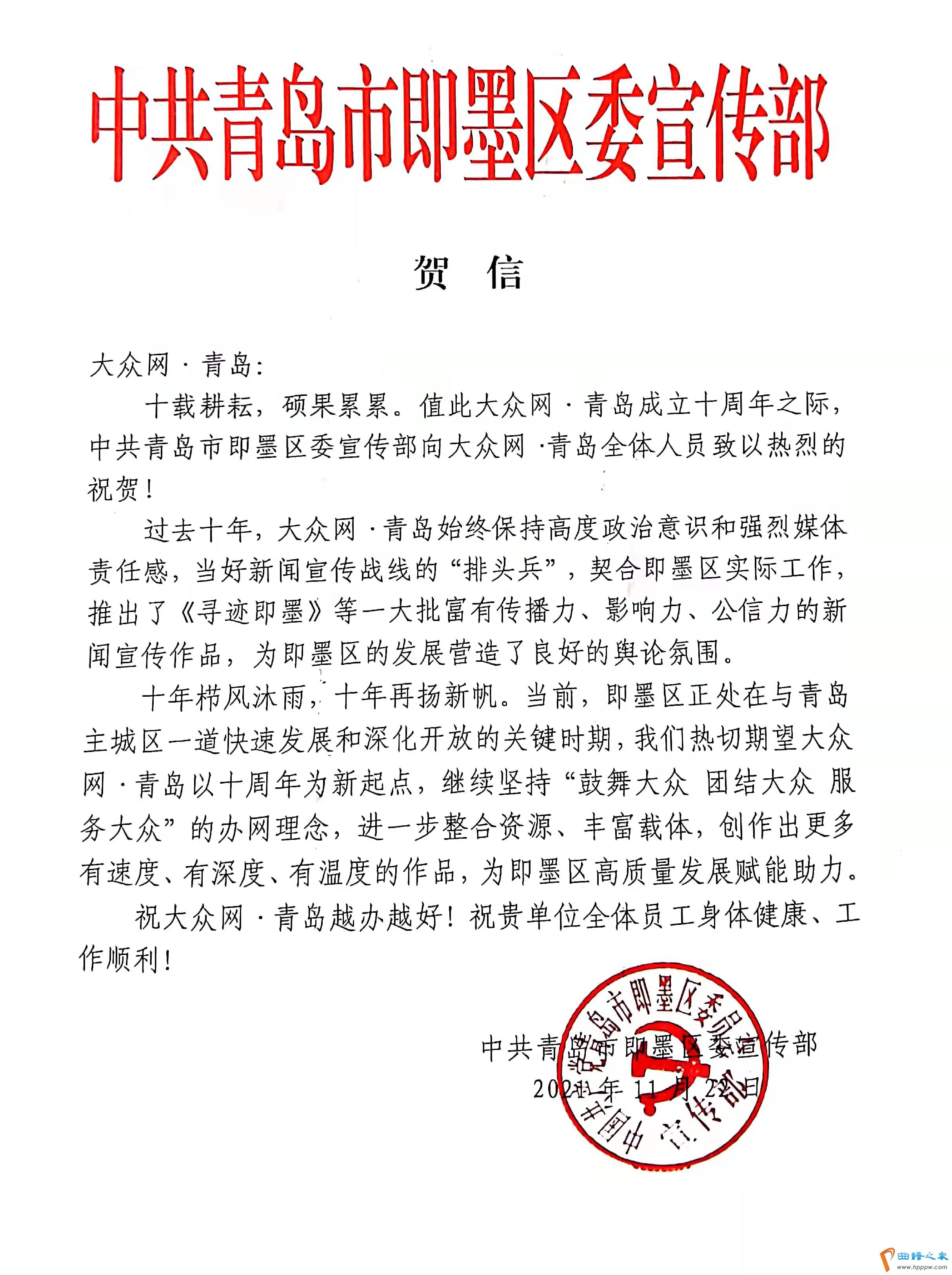 中共青岛市即墨区委宣传部发来贺电:过去十年,大众网青岛始终保持高度政治意识和强烈媒体责任感,当好新闻宣传战线的“排头兵”,契合即墨区实际工作,推出了《寻迹即墨》等一大批富有传播力、影响力、公信力的新闻宣传作品,为即墨区的发展营造了良好的舆论氛围。十年栉风沐雨,十年再扬新帆。我们热切期望大众网青岛以十周年为新起点,继续坚持“鼓舞大众团结大众服务大众”的办网理念,进一步整合资源、丰富载体,创作出更多有速度、有深度、有温度的作品,为即墨区高质量发展赋能助力。