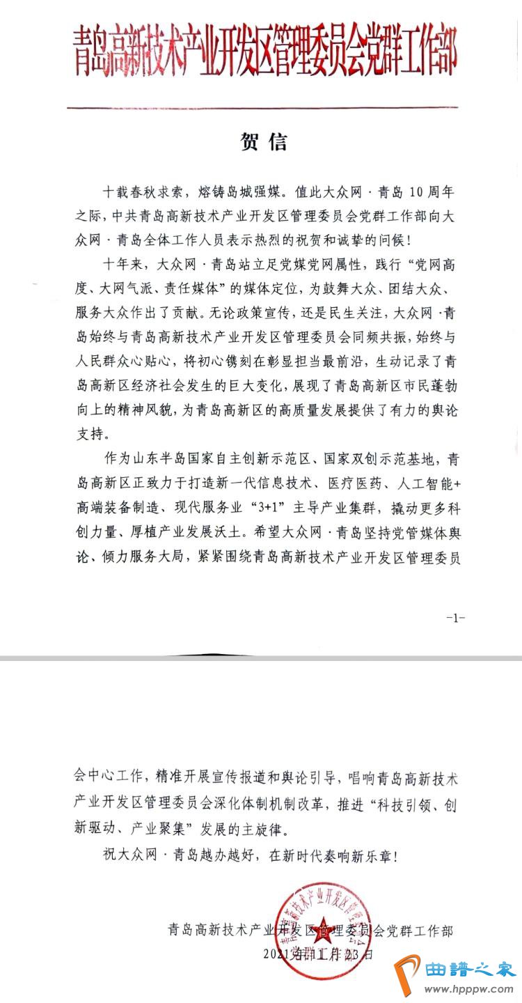 青岛高新技术产业开发区管理委员会党群工作部发来贺电:十年来,大众网青岛立足党媒党网属性,无论政策宣传,还是民生关注,大众网青岛始终与人民群众心贴心,将初心镌刻在彰显担当最前沿,生动记录了青岛高新区经济社会发生的巨大变化。希望大众网青岛坚持党管媒体舆论、倾力服务大局,紧紧围绕青岛高新技术产业开发区管理委员会中心工作,精准开展宣传报道和舆论引导,唱响青岛高新技术产业开发区管理委员会深化体制机制改革,推进“科技引领、创新驱动、产业聚集”发展的主旋律。