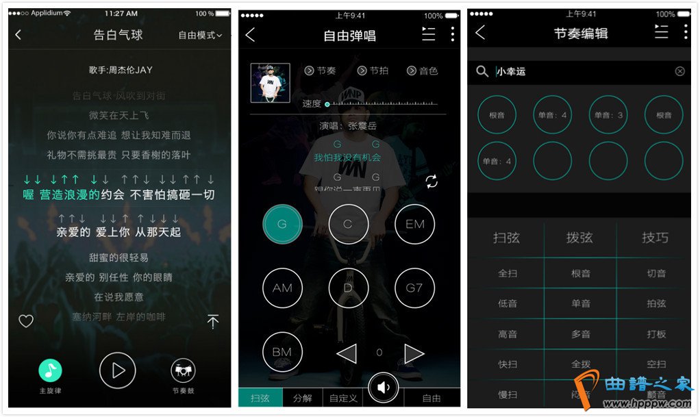 完全小白的玩家可以按照app内置谱子上“上下上下”的标识,拨动拨片,锻炼节奏感;最难模式下,左手操作更多,可以自行切换和弦、编辑节奏型和添加切音等高级技能(如下图所示)。