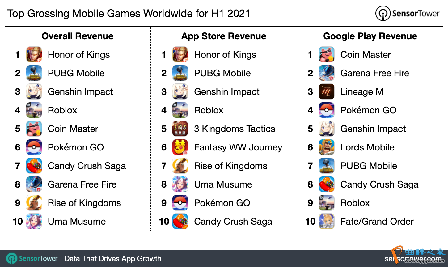 (Sensor Tower的上半年全球手游收入排行,《原神》排在Top 3)