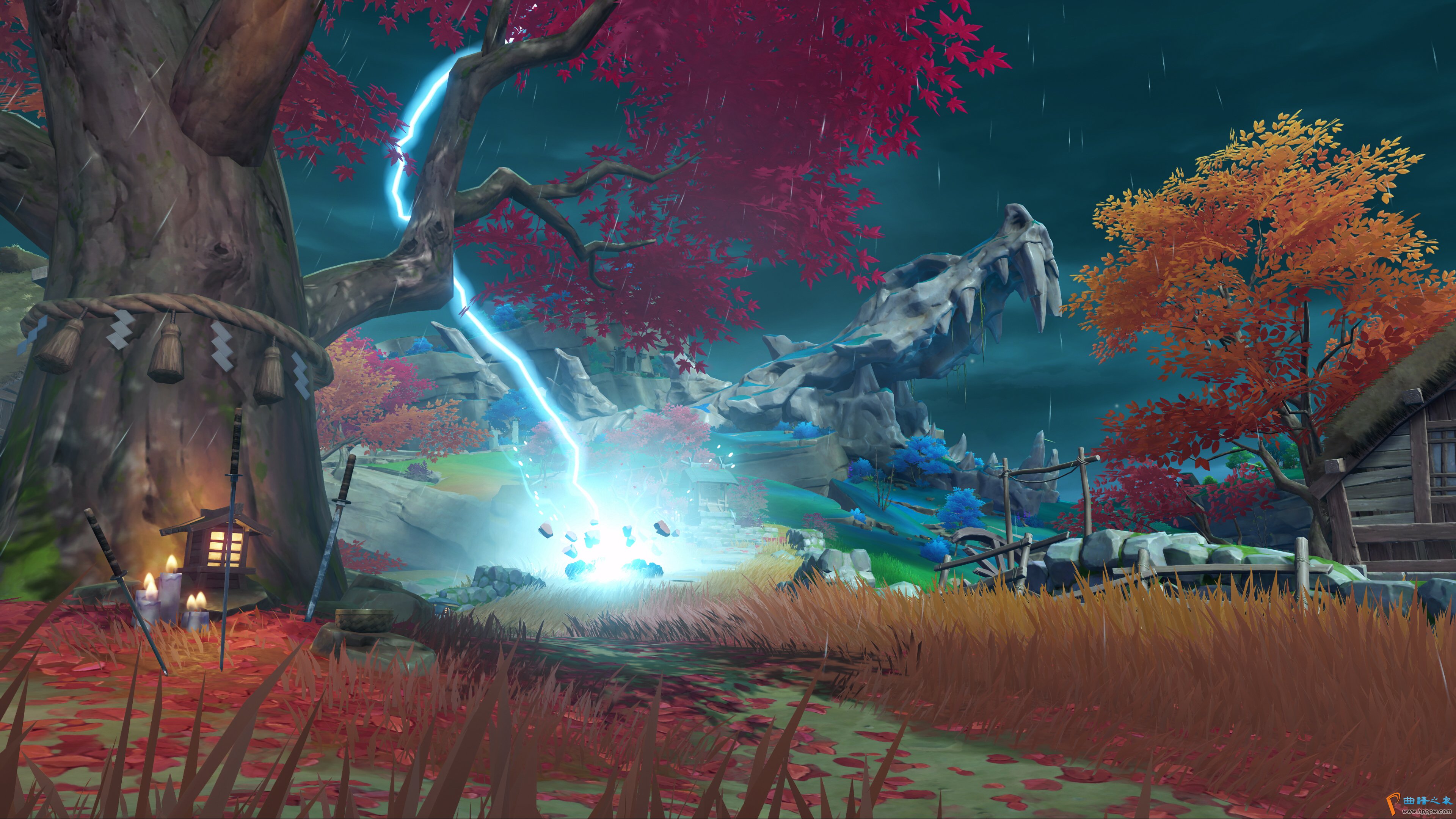 同时,依据雷元素的紫色主题色,《原神》的美术和设计部门通过联调,让游戏里的生态环境有更多的元素表达——更多的雷元素采集物,以及受雷元素影响的树木、植被等等。这让稻妻区域的主题表达,比之前两个地区都更外显、更直观。