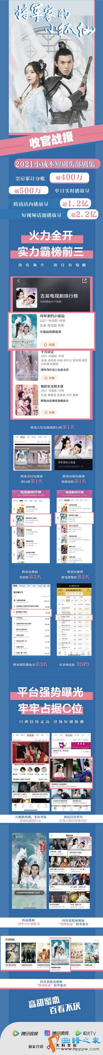 腾讯古装电视剧排行榜第一名、腾讯电视剧爱情榜第二名、腾讯电视剧甜宠偶像榜第二名、腾讯剧集播放量排名第三名、骨朵热度指数排行榜TOP3、猫眼历史最高热度值7154。88。同时在榜的还有《你是我的荣耀》、《扫黑风暴》等大卡司高流量剧集,无疑正是扎实精准的营销助力《将军家的小狐仙》在暑期档脱颖而出。
