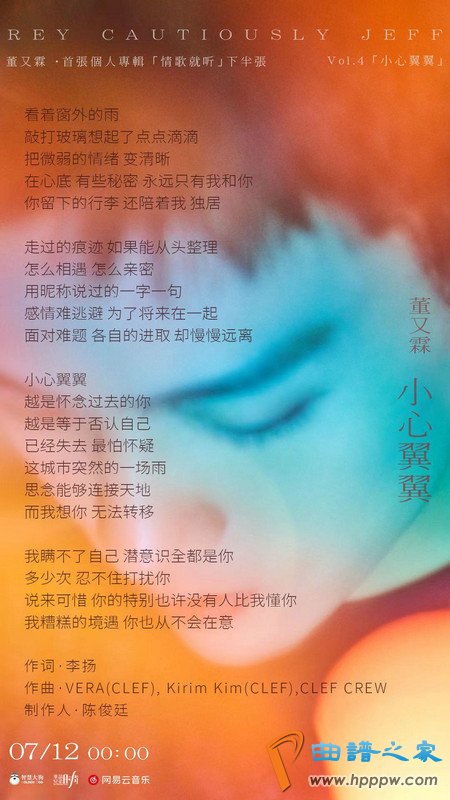据悉,董又霖个人首张专辑《情歌就听》随着歌曲《小心翼翼》的上线已进入收官阶段,期待在不久的将来能看到董又霖带来更多精彩的音乐表现!