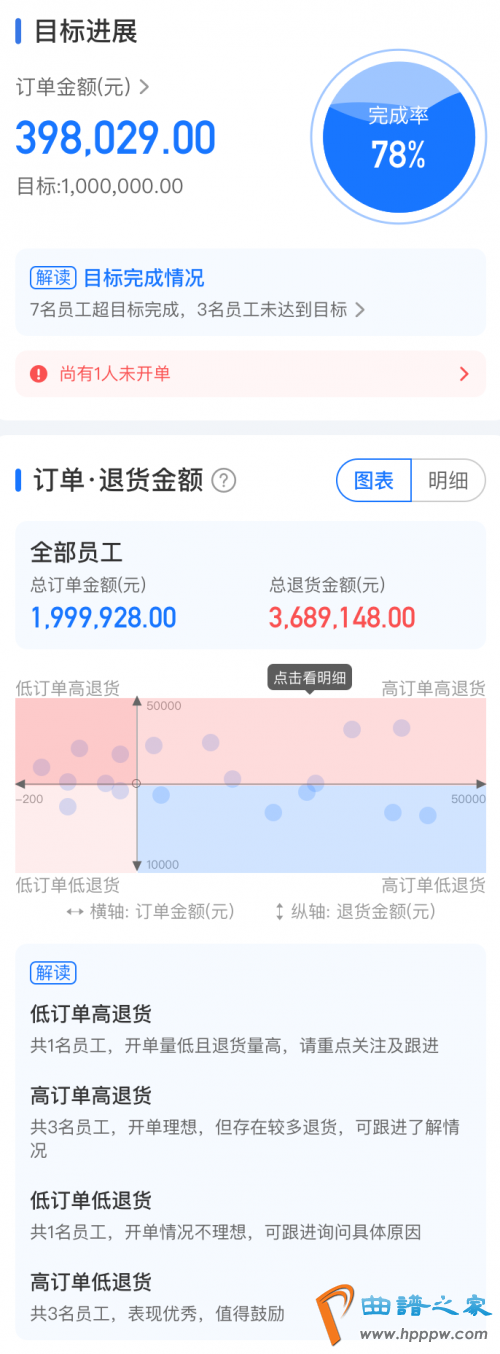 直观展现员工整体数据,包括订单情况、退货情况、回款情况等;全方位了解每个员工的数据,并从回款、拓客、销售等多维度评估员工的综合实力,帮助经销商科学管理团队。