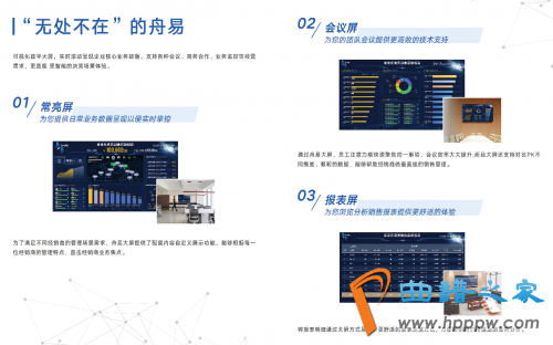 舟易数字大屏结合经销商业务特性,如会议分析、日常办公、数据演示等多种业务场景需求,构建多套大屏模块——常亮屏、会议屏、报表屏,将业务数据可视化,帮助经销商快速分析决策。
