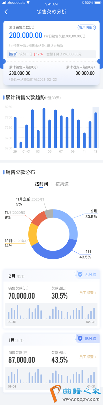 舟易支持全流程销售欠款监控,对销售欠款进行账龄分析,销售过程中,能够监控最大欠款金额,回款阶段可以提醒最大欠款时间,提示收款,对于逾期的客户可以标注金额和逾期天数,帮助经销商明确收欠款的员工和客户,规避欠款逾期风险。