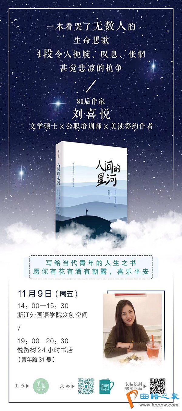 《人间的星河》是由青年作家刘喜悦历经多年探访后倾心写就,四个不同人的故事,四段让你疼痛窒息的体验。当我们走在人生低谷,前路茫茫,也要相信,那些刺痛我们的经历,终将成为我们的力量,从此未来坦荡,鸟语花香。11月9日,作者将携新书与读者分享创作心得。