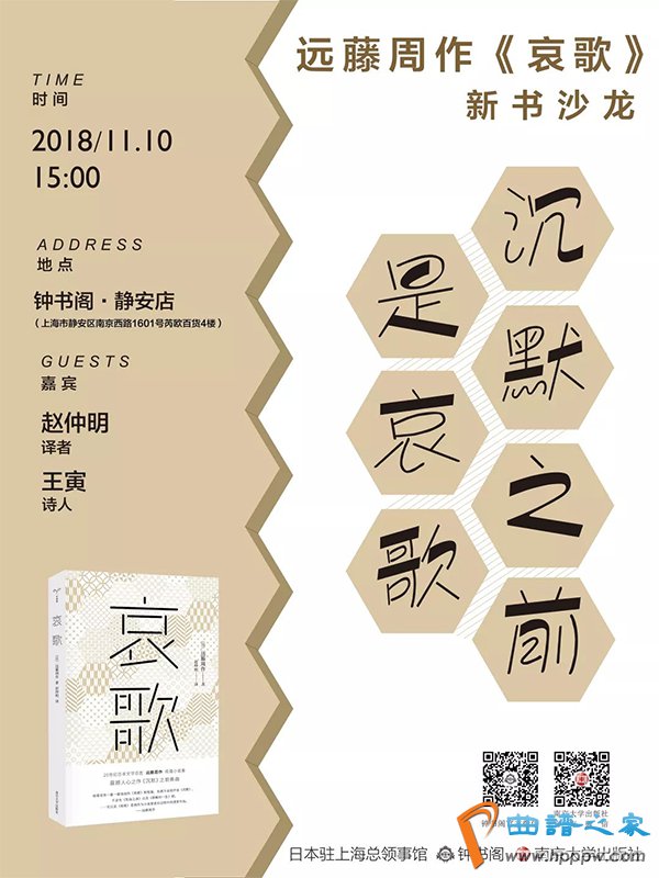 《哀歌》是远藤周作的短篇小说集,是其极具震撼力的作品《沉默》的前奏曲。在《哀歌》里,他沉迷于人与人之间浑然不觉的自私,以及由此而生的虚假与真实、温和与残忍纠结缠绕后复杂性。虽然信仰上帝,但他应该对人类充满了悲观和绝望。他深信这种沟壑无法填补,且会伴随至终。本周六下午,本书译者、南京大学外国语学院副教授赵仲明老师将为您讲解《哀歌》,解读远藤周作文学对寻求自我精神救赎所做的探索,同时将与著名诗人、作家王寅先生展开对谈。