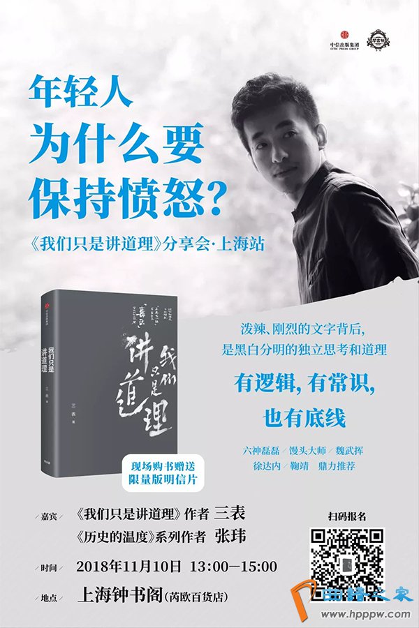 三表是公众号“三表龙门阵”的创始人,以“犀利吐槽”为主要特色,辣评时事。馒头大师张玮的公众号“馒头说”,以“历史上的今天”为特色,每天推送一个历史小故事。一个评时事,一个说历史,生活中他们却是很好的朋友,当三表遇上馒头大师,会发生什么神奇的化学反应呢?11月10日,钟书阁静安店,来听一听馒头大师和三表“讲道理”!时事×历史的碰撞,和我们聊一聊年轻人为什么要保持愤怒。