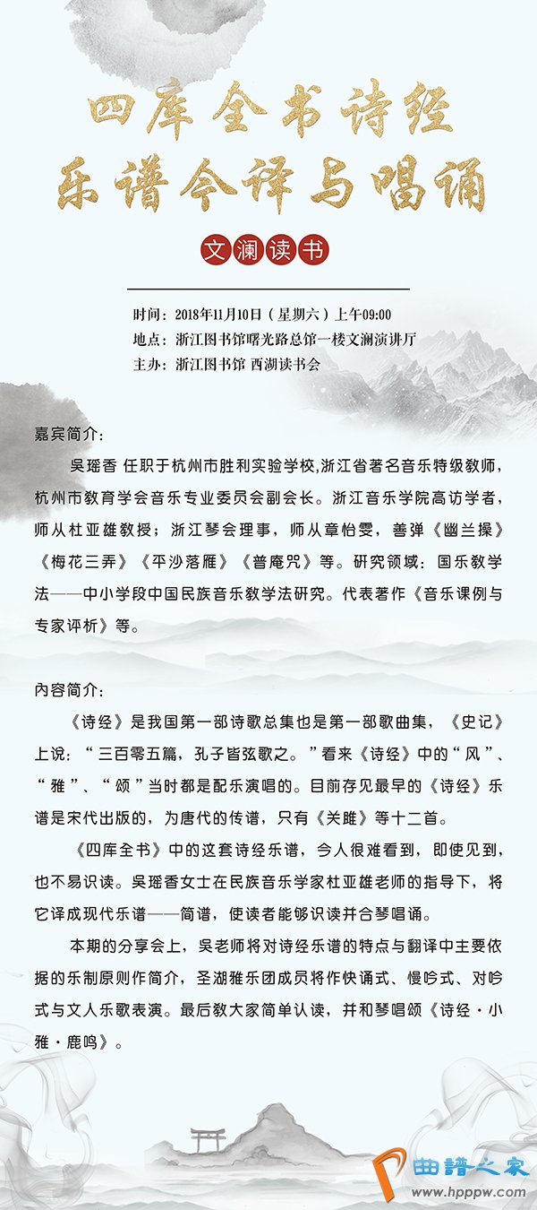 《诗经》是我国第一部诗歌总集也是第一部歌曲集,明代大音乐家朱载堉曾为《诗经》谱曲,他没有遵循一字一音的原则,清代的一些学者认为朱载堉的作品失去了古代的风格,于是在1772-1778年间,按照古风,又为《诗经》编写了曲谱,并收入《四库全书》。本次讲座,吴老师将作诗经乐谱的特点与翻译中主要依据的乐制原则简介,圣湖雅乐团成员将作快诵式、慢吟式、对吟式与文人乐歌表演,教大家简单认读,并和琴唱颂《诗经·小雅·鹿鸣》。