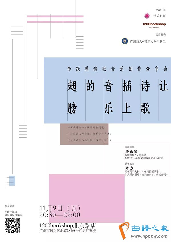 11月9日晚,1200Bookshop北京路店,音乐制作人、作曲家李跃瀚将来到现场,为我们讲述诗歌和音乐的那些事。