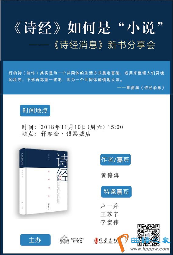 现代以来,《诗经》主要被当作一部诗集,得到阅读、研究,对它的体会、品味也常常从文学角度出发。青年作家、批评家黄德海在《诗经消息》中,通过对两千多年来历代解《诗经》之言说的解读、辨析和拣择,以此去探寻《诗经》产生时代的历史图景,以及后世著名解诗人的内心关切和用世情怀。最终,带回了一部经典在今日依旧能够因应世事、映照精神、安放灵魂的新鲜消息。本周六下午,黄德海及特邀嘉宾卢一萍、李宏伟、王苏辛,共聚轩客会·银泰店,在诗与经之间,探讨言语之路。