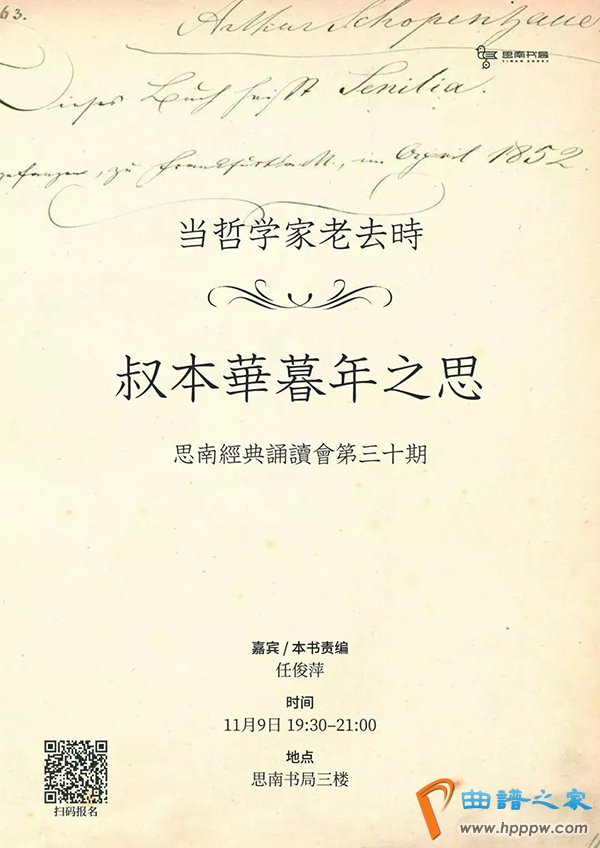 叔本华(Arthur Schopenhauer,1788-1860)是德国著名哲学家,唯意志主义和现代悲观主义创始人。他也是一位优秀的散文家和箴言家,《叔本华暮年之思》收录了叔本华生前未公开的两部作品,《老之境》与《自我拷问——沉思录》。《老之境》是他晚年的随想,一本老来充满智慧箴言的著作;《自我拷问——沉思录》是他晚年“面对自我”的观察,表达了对自己本性中的弱点的讽刺与无奈,有点“忏悔录”的味道,可说是作者对自己生命的最后告白。本周五晚,我们将一起诵读《叔本华暮年之思》,本书责编任俊萍老师将带领我们走进叔本华晚年的思想世界。