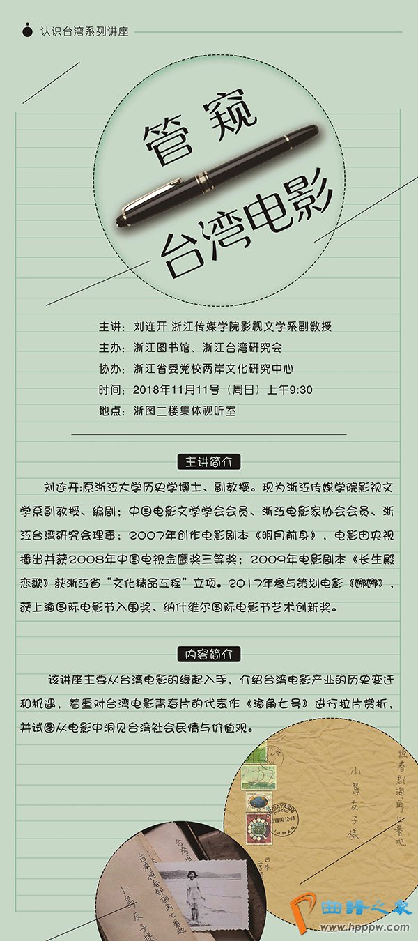 本次讲座主要从台湾电影的缘起入手,介绍台湾电影产业的历史变迁和机遇,着重对台湾电影青春片的代表作《海角七号》进行拉片赏析,并试图从电影中洞见台湾社会民情与价值观。